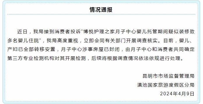央視網(wǎng)消息:據(jù)“滇池度假發(fā)布”官微消息,昆明市市場監(jiān)督管理局滇池國家旅游度假區(qū)分局通報(bào),近日,該局接到消費(fèi)者投訴“博悅護(hù)理之家月子中心嬰兒托管期間疑似裝修致多名嬰兒住院”,該局高度重視,立即會同有關(guān)部門開展調(diào)查核實(shí)。目前,嬰兒、產(chǎn)婦已全部轉(zhuǎn)移安置,月子中心涉事房屋已封閉,由月子中心和消費(fèi)者共同確定第三方專業(yè)檢測機(jī)構(gòu)對其開展檢測,后續(xù)將根據(jù)調(diào)查情況依法依規(guī)進(jìn)行處理。