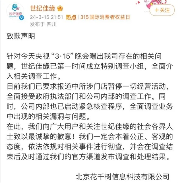 值得一提的是,今年央視3·15晚會曝光珍愛網(wǎng)、世紀佳緣、戀愛課等多家婚戀平臺涉嫌用優(yōu)質(zhì)的異性資源、0門檻的誘人廣告、言之鑿鑿的成功案例作為噱頭,欺騙消費者。對此,世紀佳緣致歉稱,第一時間成立特別調(diào)查小組,全面介入相關調(diào)查工作。目前公司已要求報道中所涉門店暫停一切經(jīng)營活動,全面接受政府執(zhí)法部門和公司內(nèi)部的調(diào)查工作。同時,公司內(nèi)部也已啟動緊急核查程序,全面調(diào)查業(yè)務中出現(xiàn)的相關漏洞與問題。珍愛網(wǎng)官方微博發(fā)布致歉聲明,稱在第一時間成立專項小組,采取最嚴措施,全面深入調(diào)查并立即處理相關問題。