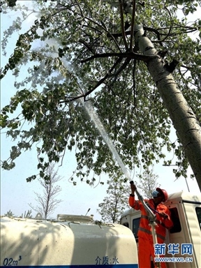 圖六:在北京豐臺(tái)區(qū),一名工作人員用高壓水槍對(duì)楊樹(shù)雌株進(jìn)行噴水濕化以減少飛絮。(來(lái)源:新華社)