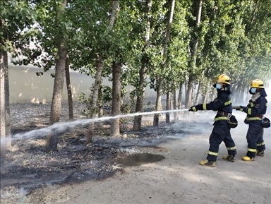 圖三:2023年5月2日,河南省濟(jì)源市消防救援支隊(duì)濟(jì)瀆路特勤站在處置飛絮引發(fā)的火情(來(lái)源:新華社)