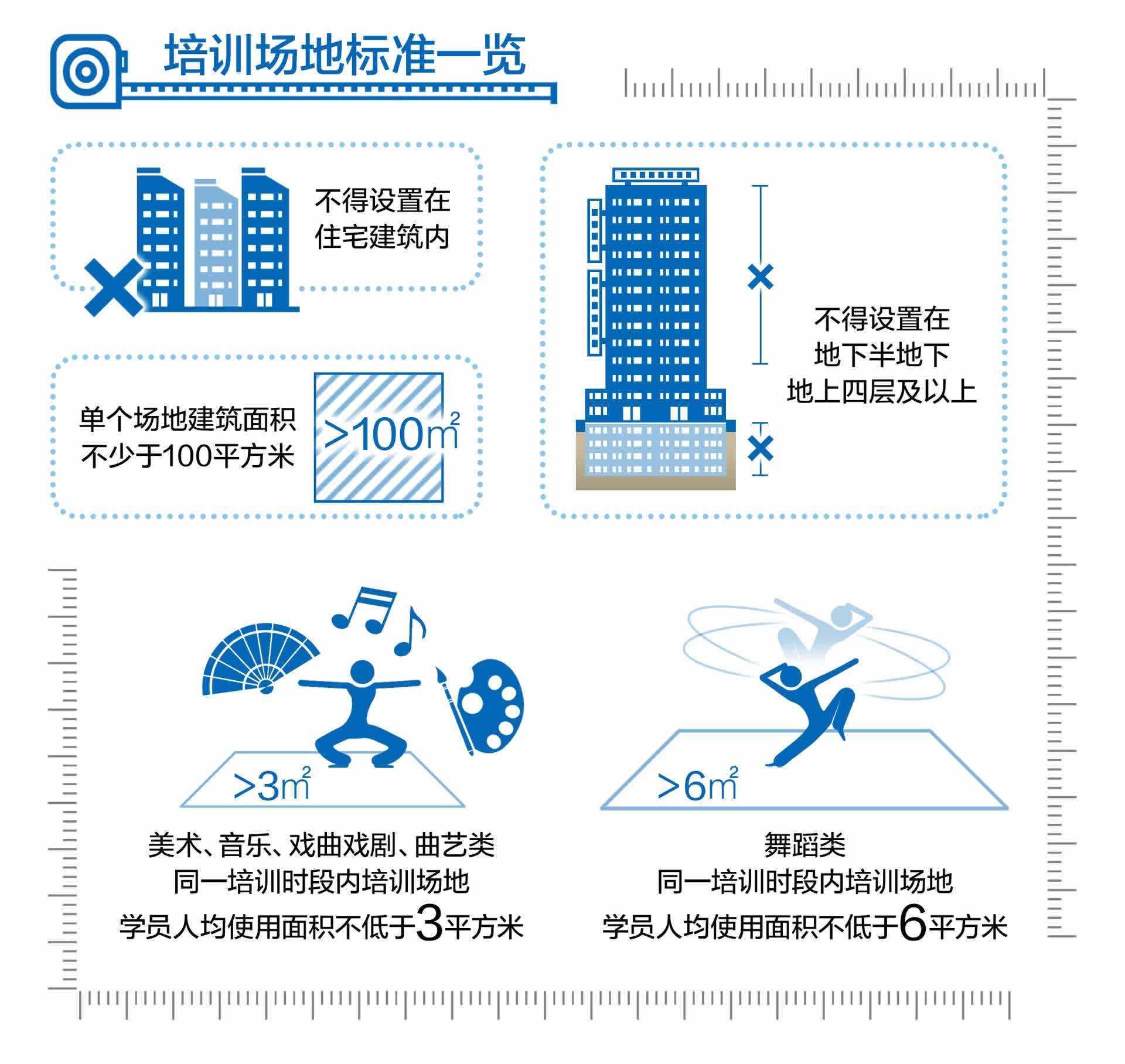 具體到店面內(nèi)部硬件,《標(biāo)準(zhǔn)》明確,開展培訓(xùn)教學(xué)的單個(gè)場(chǎng)地建筑面積應(yīng)不少于100平方米,美術(shù)、音樂、戲曲戲劇、曲藝類同一培訓(xùn)時(shí)段內(nèi)培訓(xùn)場(chǎng)地學(xué)員人均使用面積不低于3平方米,舞蹈類同一培訓(xùn)時(shí)段內(nèi)培訓(xùn)場(chǎng)地學(xué)員人均使用面積不低于6平方米,確保不擁擠、易疏散。