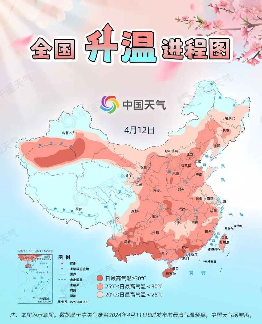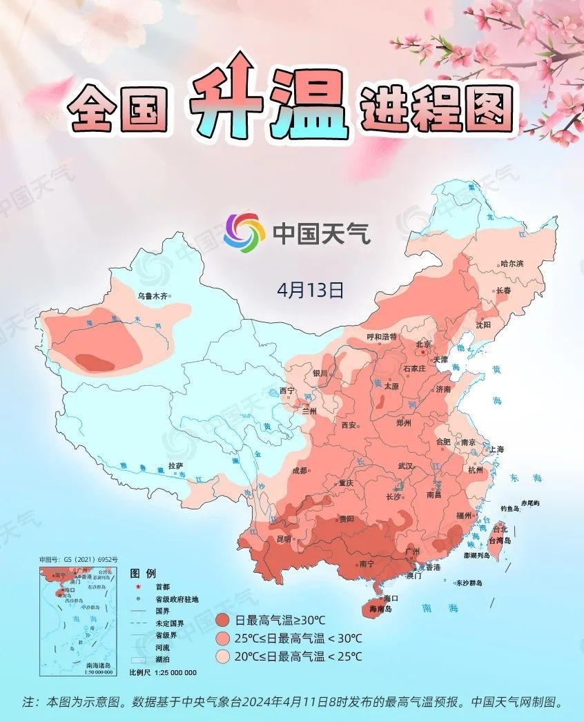 眼下,全國(guó)大部處于冷空氣影響間歇期,升溫是主旋律。預(yù)計(jì)今起三天(4月11日至13日),我國(guó)從北到南都將開啟回暖進(jìn)程,最高氣溫25℃以上的區(qū)域幾乎覆蓋整個(gè)中東部,波及20余省份,東北、西北地區(qū)氣溫將大面積創(chuàng)今年以來新高,北方不少地方還會(huì)體驗(yàn)到常年5月中旬才有的超前暖熱。中國(guó)天氣網(wǎng)推出全國(guó)升溫進(jìn)程圖,看看哪些地方將沖擊30℃。