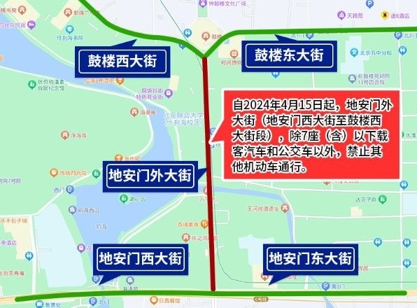 為確保全國(guó)重點(diǎn)文物保護(hù)單位“大運(yùn)河——玉河故道(澄清上閘含萬(wàn)寧橋)”的文物安全與交通安全,根據(jù)文物保護(hù)和道路交通安全有關(guān)法律法規(guī)規(guī)定,決定自2024年4月15日起,地安門(mén)外大街(地安門(mén)西大街至鼓樓西大街段),除7座(含)以下載客汽車(chē)和公交車(chē)以外,禁止其他機(jī)動(dòng)車(chē)通行。
