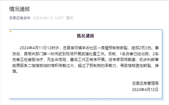 央視網(wǎng)消息:據(jù)“忠縣應急發(fā)布”公眾號消息,重慶忠縣應急管理局通報,2024年4月11日12時許,忠縣官壩鎮(zhèn)豐收社區(qū)一房屋預制板斷裂,造成2死3傷。事發(fā)后,縣相關部門第一時間趕到現(xiàn)場開展救援處置工作。目前,1名傷者已經(jīng)出院,2名傷者正在接受治療,無生命危險,善后工作正有序開展。經(jīng)專家現(xiàn)場勘查,初步判斷事故原因系二樓樓板臨時堆積荷載過大,超過了預制板的承載力,導致樓板脆性斷裂、掉落。