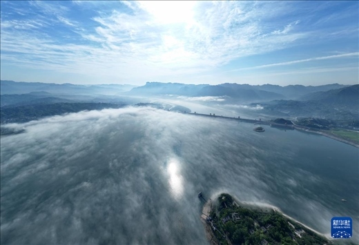 當(dāng)日,雨過(guò)天晴的三峽大壩及附近水域上空云霧繚繞,美景如畫(huà)。