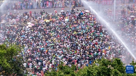 4月12日,云南省德宏傣族景頗族自治州2024年潑水狂歡節(jié)在芒市開(kāi)幕,上萬(wàn)名當(dāng)?shù)馗髯迦罕娕c遠(yuǎn)道而來(lái)的游客歡聚芒市廣場(chǎng),互相潑水祝福。