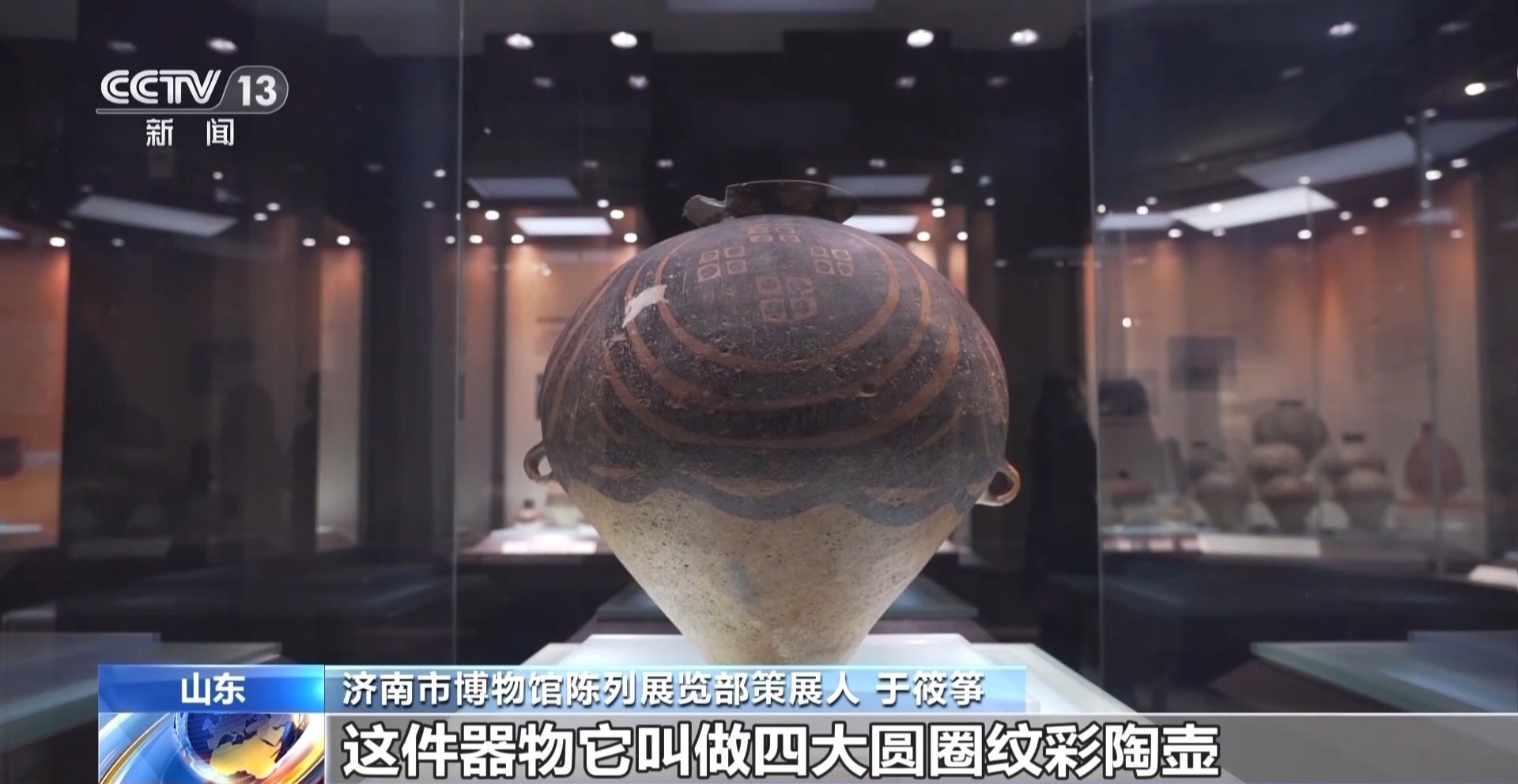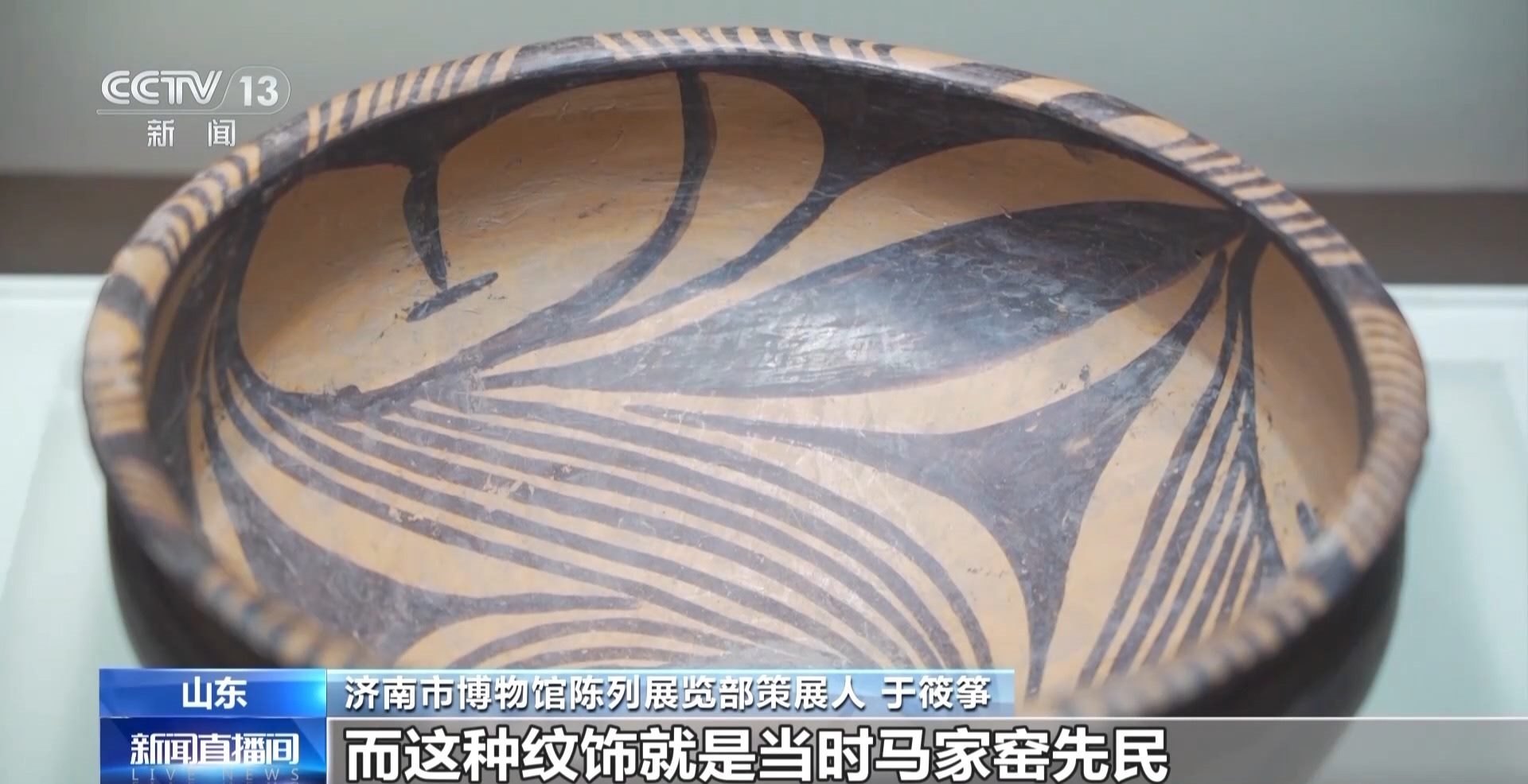 濟(jì)南市博物館陳列展覽部策展人 于筱箏:例如我們此次展覽中展出的兩件非常重要的漩渦紋彩陶壺和漩渦紋彩陶盆,其上均是以漩渦紋為主要紋飾,而這種紋飾就是當(dāng)時(shí)馬家窯先民對于黃河奔騰河水的一種非常概括,以及極富想象力的描繪,它們也是新石器時(shí)代晚期黃河文明形成與發(fā)展的一種重要見證。
