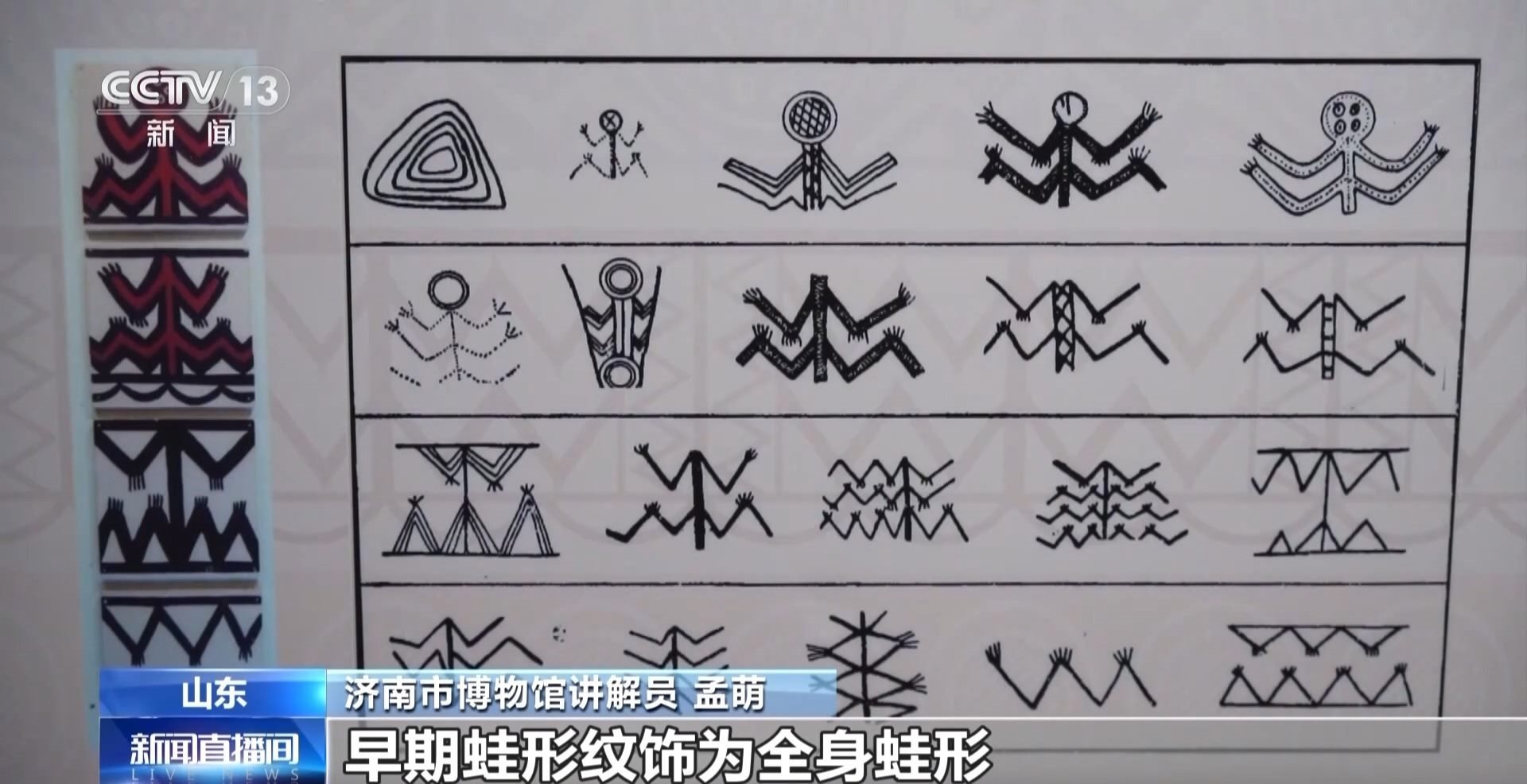 濟(jì)南市博物館講解員 孟萌:早期蛙形紋飾為全身蛙形,在這一時(shí)期蛙頭部往往是圓圈形,里面繪有不同的圖案,而它的四肢往往是波狀紋,并且它的足是有不同的趾,到了中期則變得更為簡化和自然,而到了晚期變成了一種結(jié)構(gòu)化的圖案。體現(xiàn)了他們希望自己的部落能夠繁衍生息、發(fā)展壯大的美好愿景。