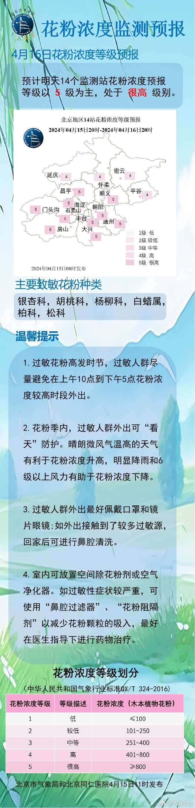 央視網消息:@?氣象北京 發(fā)布花粉實況及花粉濃度預報,昨日(4月14日)北京6站大部花粉濃度等級為4級。目前本市主要致敏花粉種類為銀杏科、胡桃科、楊柳科,白蠟屬,柏科,松科等。預計4月15日14站花粉濃度以5級為主,為很高級別(>800)。今天有大風沙塵天氣,大部分地區(qū)花粉濃度為很高級別,敏感人群外出需注意做好健康防護。