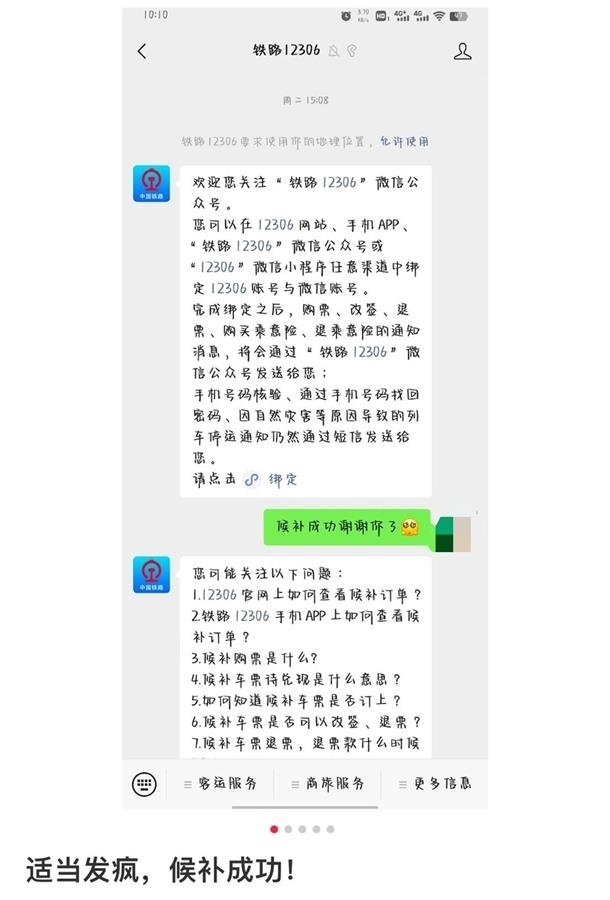 “你不理我是因?yàn)樵诮o我候補(bǔ)嗎”“親愛(ài)的我要票”……另一名網(wǎng)友也發(fā)帖稱(chēng),自己使用向12306微信公眾號(hào)“發(fā)瘋”的辦法,成功候補(bǔ)到了車(chē)票,其發(fā)布的網(wǎng)帖題為“適當(dāng)發(fā)瘋候補(bǔ)成功”。