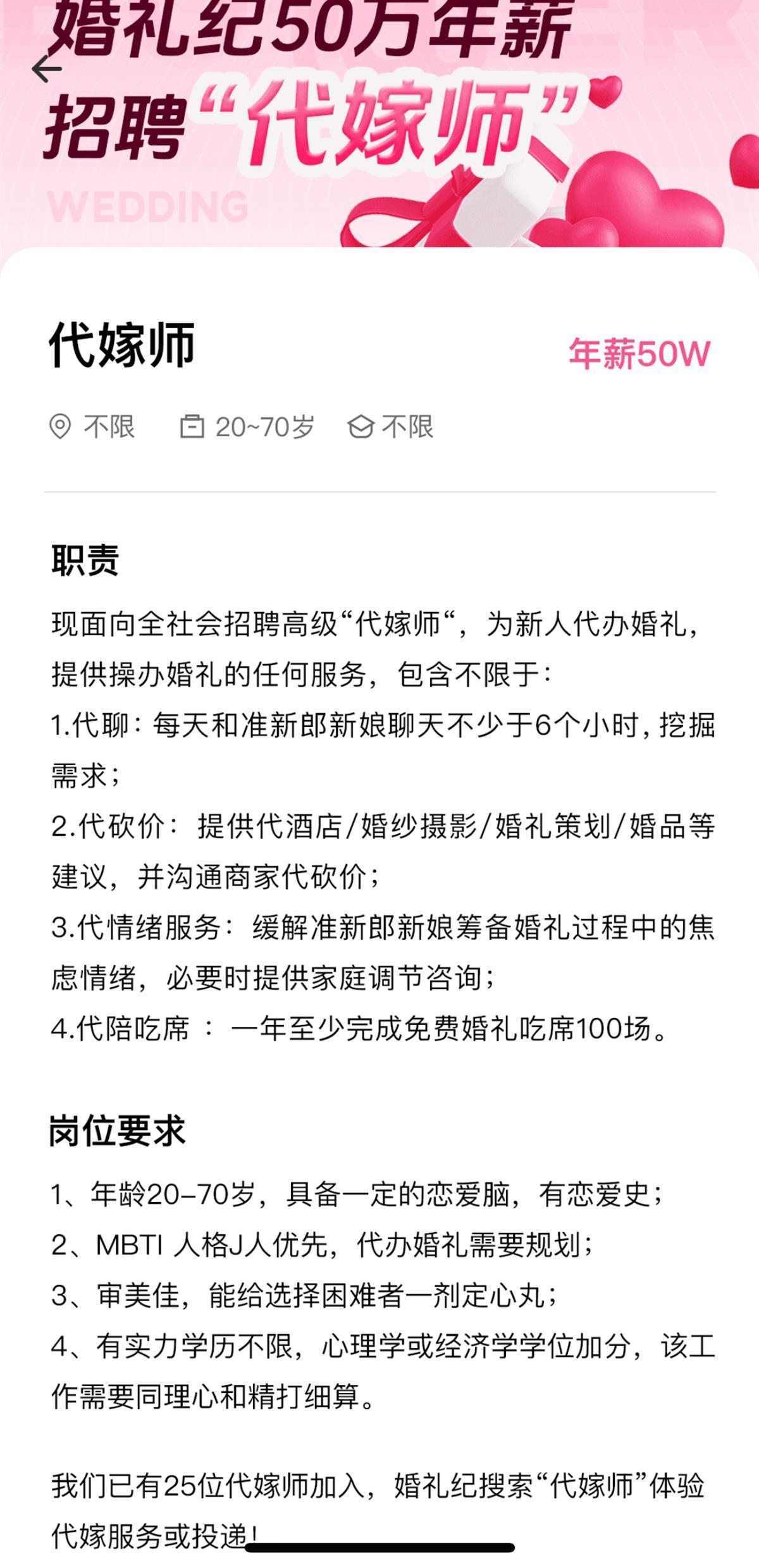 點擊該頁面下方的“成為代嫁師”按鈕,便進入了網(wǎng)上流傳的關(guān)于代嫁師的崗位介紹:“代嫁師”的工作內(nèi)容包含但不限于代聊、代砍價、代情緒服務(wù)、代陪吃席等,其中代聊服務(wù)要求“每天和準新郎新娘聊天不少于6個小時”,代陪吃席要求“一年至少完成免費婚禮吃席100場”。崗位要求:1、年齡20-70歲,具備一定戀愛腦,有戀愛史;2、MBTI人格J人優(yōu)先,代辦婚禮需要規(guī)劃;3、審美佳,能給選擇困難者一劑定心丸;4、有實力學(xué)歷不限,心理學(xué)或經(jīng)濟學(xué)學(xué)位加分,該工作需要同理心和精打細算。