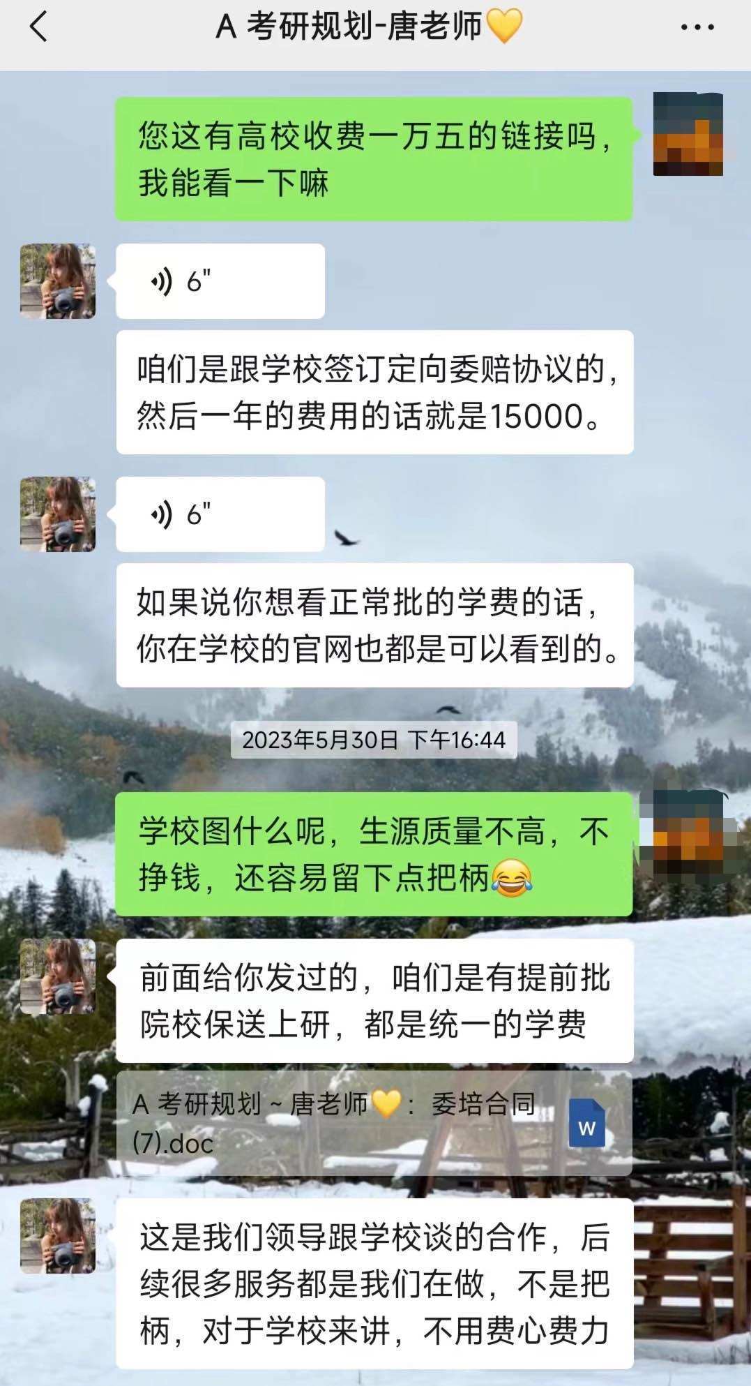 來自北京的陳鑫(化名)說,他被上述話術(shù)吸引,去年5月報了廣州研才教育機構(gòu)的“院校推免保送研究生課程”。咨詢時,招生老師向他承諾“渠道直錄,考研保過”,并稱還能通過“院校委培”的方式,幫他把20萬元左右的MBA學費降為1.5萬元。