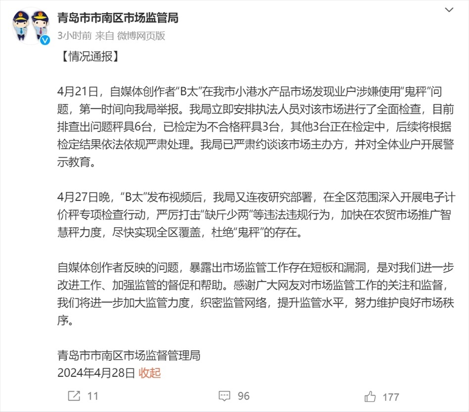 青島市市南區(qū)市場監(jiān)督管理局安排執(zhí)法人員對該市場進行了全面檢查,目前排查出問題秤具6臺,已檢定為不合格秤具3臺,其他3臺正在檢定中,后續(xù)將根據檢定結果依法依規(guī)嚴肅處理。