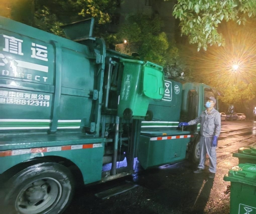 2024年5月4日凌晨,杭州市環(huán)境集團(tuán)清運(yùn)車(chē)駕駛員朱國(guó)棟在清運(yùn)垃圾。(杭州市環(huán)境集團(tuán)供圖)