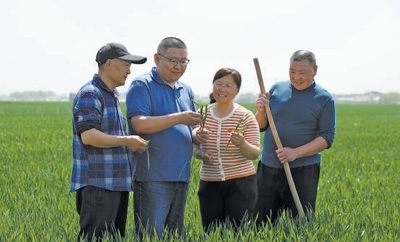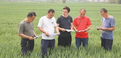 蘇丹(中)在指導(dǎo)村民進行小麥揚花期田間管理。本報記者 原韜雄攝