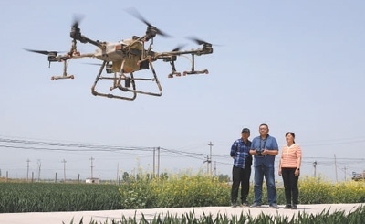 薛麗娜(右一)指導(dǎo)村民使用無人機噴灑農(nóng)藥。陳 陽攝