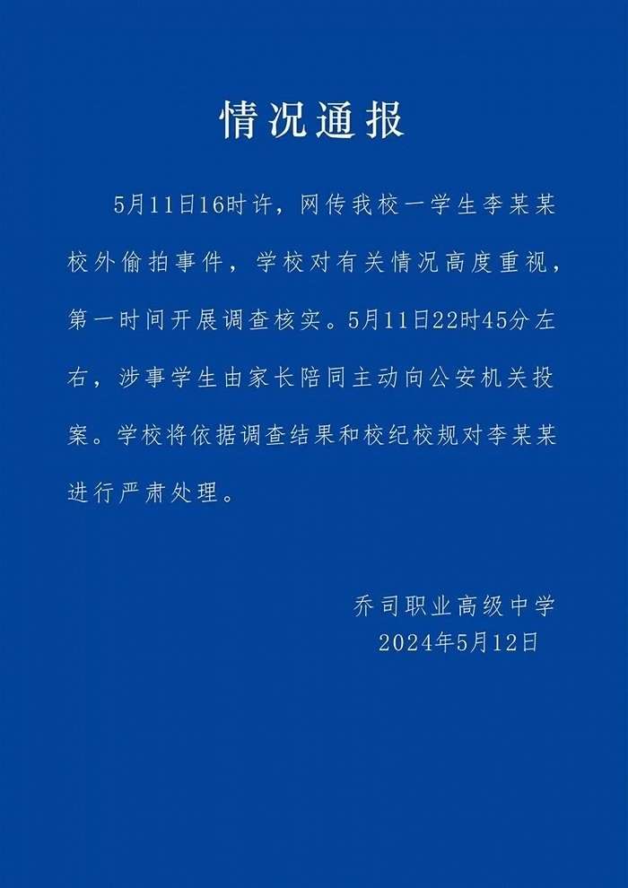 央視網(wǎng)消息:杭州市喬司職業(yè)高級(jí)中學(xué)5月12日發(fā)布情況通報(bào),5月11日16時(shí)許,網(wǎng)傳我校一學(xué)生李某某校外偷拍事件,學(xué)校對(duì)有關(guān)情況高度重視,第一時(shí)問(wèn)開展調(diào)查核實(shí)。5月11日22時(shí)45分左右,涉事學(xué)生由家長(zhǎng)陪同主動(dòng)向公安機(jī)關(guān)投案。學(xué)校將依據(jù)調(diào)查結(jié)果和校紀(jì)校規(guī)對(duì)李某某進(jìn)行嚴(yán)肅處理。