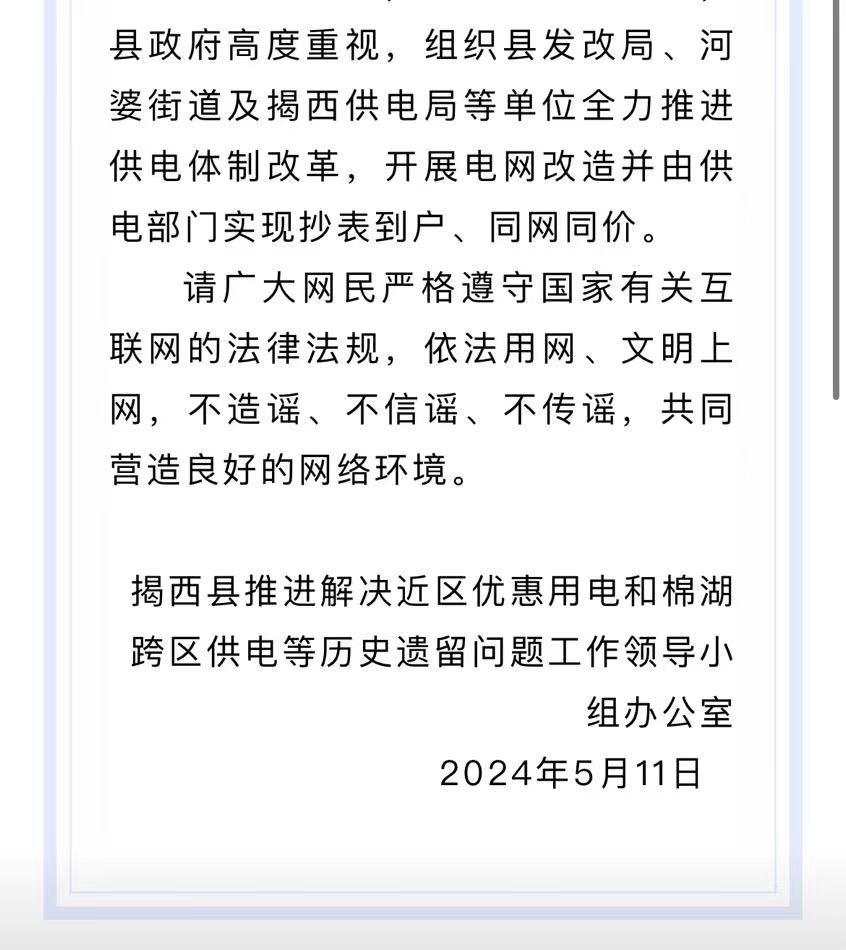 針對此事,“揭西發(fā)布”微信公眾號(hào)于5月12日發(fā)布了情況說明,表示對網(wǎng)上反映的“村民稱電費(fèi)從3毛漲到6毛8交不起”的問題高度重視,并已立即開展調(diào)查。