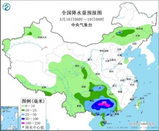 5月18日08時至19日08時,內(nèi)蒙古東南部、江南南部和西部、重慶中西部、西南地區(qū)東南部、華南大部等地部分地區(qū)有中到大雨,其中,湖南南部、貴州東南部、廣西中北部及南部沿海、廣東西北部及南部沿海等地部分地區(qū)有暴雨或大暴雨(100~210毫米);西藏東部、青海中東部、川西高原等地的部分地區(qū)有中到大雪(雨或雨夾雪)。內(nèi)蒙古中部、黑龍江東北部、新疆南疆盆地等地部分地區(qū)有4~6級風(fēng)(見圖2)。