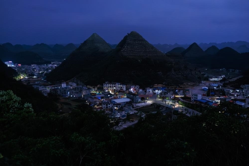 這是在夜色中拍攝的安龍縣郊外形狀酷似金字塔的山體(無人機(jī)照片,5月14日攝)。新華社記者 劉續(xù) 攝