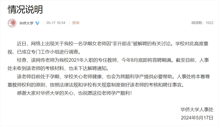 ·孕期女老師因“非升即走”被解聘?華僑大學回應:未下達解聘通知。