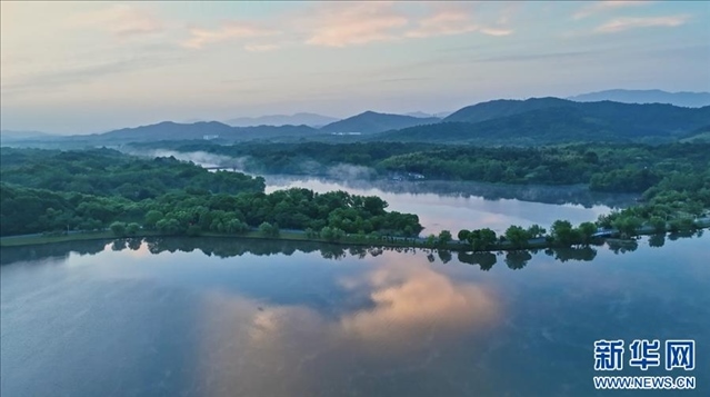 初夏雨后,位于安徽省池州市的平天湖風景區(qū)一派恬靜安詳景象,寬闊碧綠的湖面平靜如鏡,倒映著周圍的山巒和樹木,形成了一幅美麗的山水畫卷。