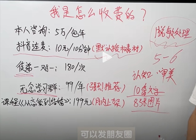 此外,不少婚戀軍師都公開了聯(lián)系方式,通過提供一對一指導(dǎo)、付費視頻、情感課程、收徒、經(jīng)營朋友圈教學(xué)等形式斂金,且價格不菲。