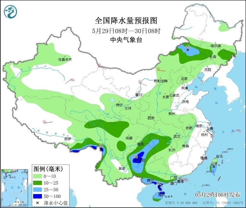 明天,強(qiáng)降雨落區(qū)與今天較為相似,但降雨強(qiáng)度有所減弱,內(nèi)蒙古中東部、貴州、廣西南部、廣東西南部、海南島及西藏東南部等地將有大雨或暴雨。