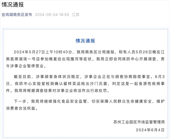 央視網(wǎng)消息:據(jù)蘇州工業(yè)園區(qū)市場監(jiān)督管理局通報(bào),5月27日上午10時(shí)40分,商務(wù)區(qū)分局接報(bào),稱有人員5月26日晚在江南首席湖濱一號店參加晚宴后出現(xiàn)腹瀉等癥狀。該局立即會(huì)同疾防中心開展調(diào)查,責(zé)令涉事企業(yè)暫停營業(yè)。
