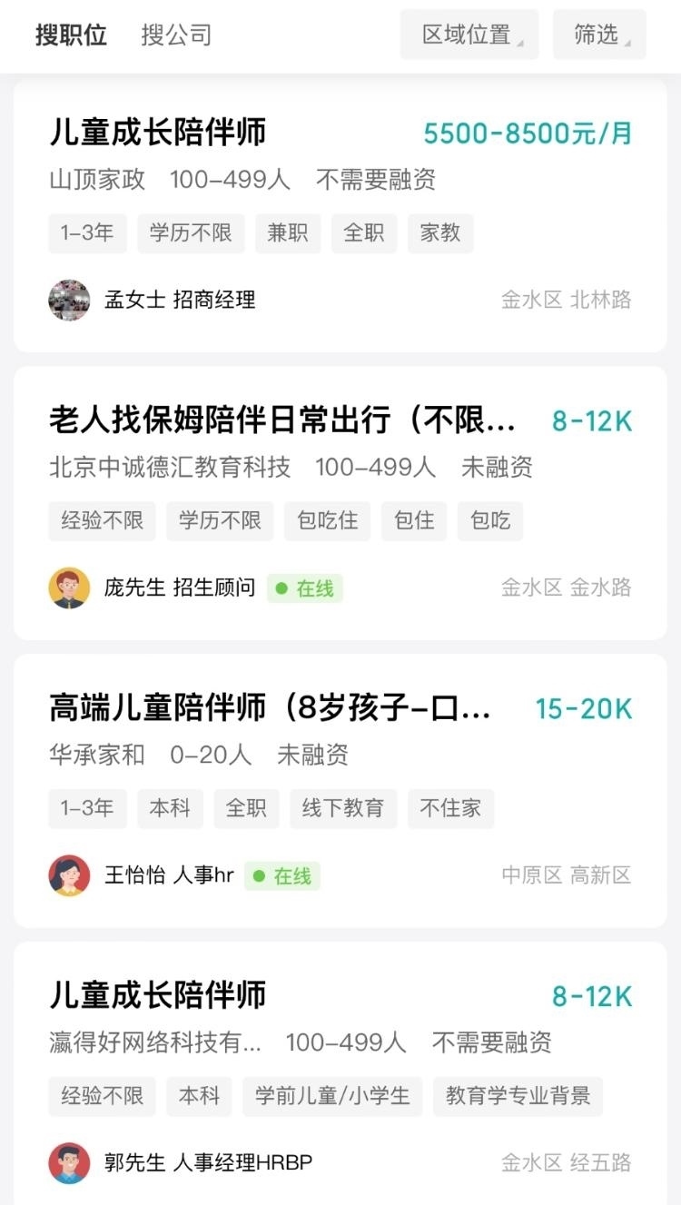 相較于之前在機構(gòu)上班,文文提到,兒童成長陪伴師這份工作更加自由,薪資也更高些?!懊吭履苣玫?萬元左右,因為我做的工作比較基礎(chǔ)。有些雇主要求會高些,比如需要教授鋼琴、繪畫,或者要求海外留學經(jīng)歷、見識廣等等。據(jù)我了解,本科生的薪資大概在1.5萬元至2萬元之間,研究生、海歸大多在2萬元以上。”