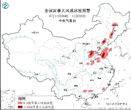 圖2 全國雷暴大風(fēng)或冰雹預(yù)警圖(6月14日08時-15日08時)