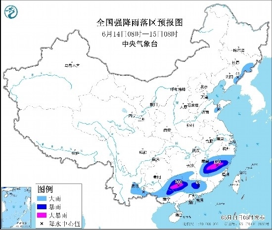圖4 全國降水量預(yù)報圖(6月14日08時-15日08時)