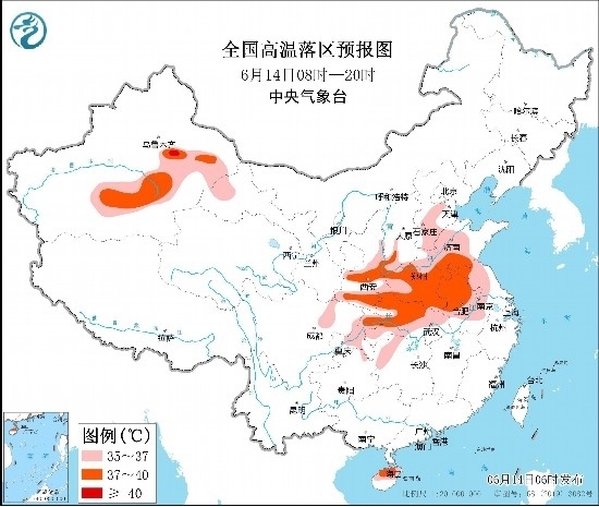 預(yù)計6月14日至15日,河北中南部、山西南部、陜西大部、黃淮、江淮、湖北北部以及內(nèi)蒙古西部、新疆南疆盆地等地有高溫天氣,局地可達(dá)40℃以上。