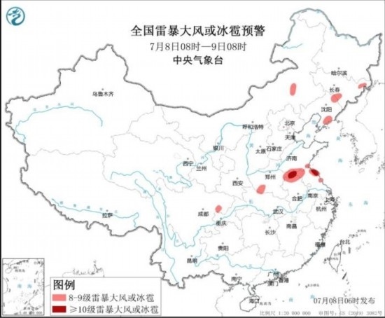 全國雷暴大風(fēng)或冰雹預(yù)警(7月8日08時-9日08時)