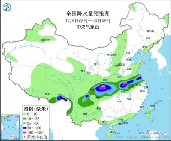 7月8日08時至9日08時,陜西南部、黃淮大部、江漢北部、四川盆地等地的部分地區(qū)有大到暴雨,其中,山東南部、河南東部和南部、蘇皖北部、四川盆地東北部等地的部分地區(qū)有大暴雨,山東南部、江蘇北部等地局地特大暴雨(250~270毫米)。內(nèi)蒙古中部、遼東半島等地的部分地區(qū)有4~5級風(fēng);黃海中部海域有5~7級、陣風(fēng)8級的旋轉(zhuǎn)風(fēng)轉(zhuǎn)偏東風(fēng),其中部分海域風(fēng)力可達8級、陣風(fēng)9級。