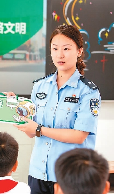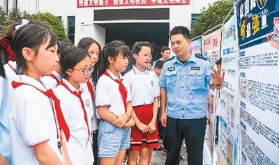 江西省宜春市公安局袁州分局鳳凰派出所民警在黃頗小學向學生講解防范網絡詐騙等知識。周 亮攝(人民視覺)