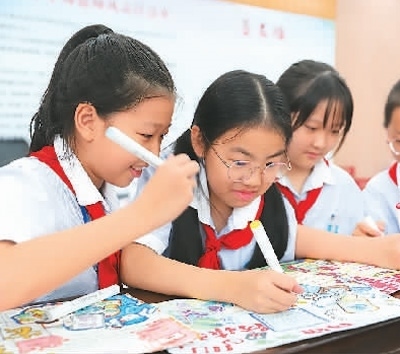 浙江省臺州市路橋區(qū)螺洋小學的學生繪制網絡安全宣傳手抄報。蔣友青攝(人民視覺)