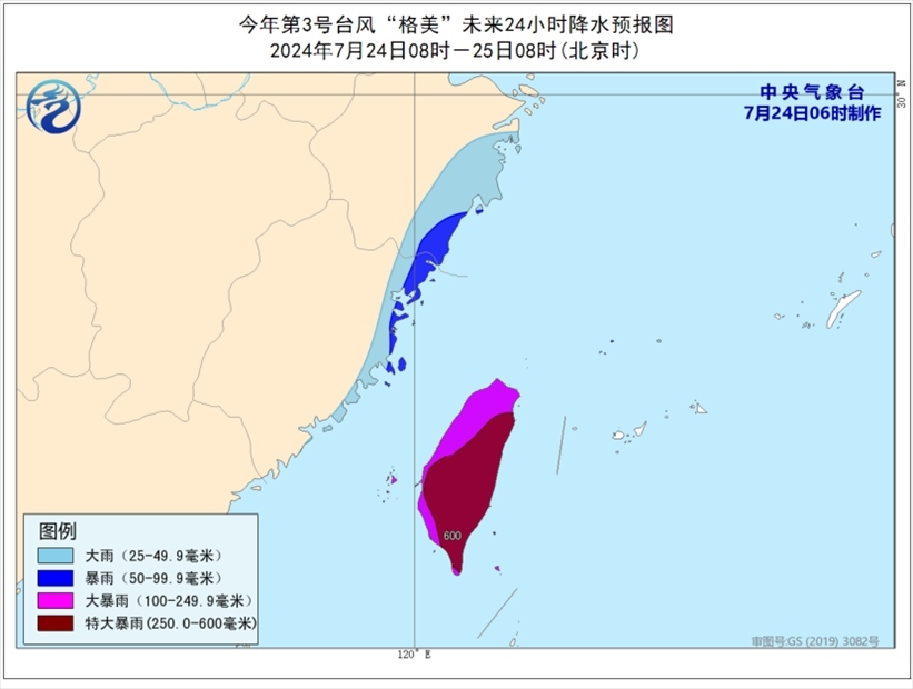 降水預(yù)報(bào):7月24日08時(shí)至25日08時(shí),浙江東南部、福建東部將有大到暴雨,臺灣島有大暴雨,部分地區(qū)特大暴雨(250-600毫米)。