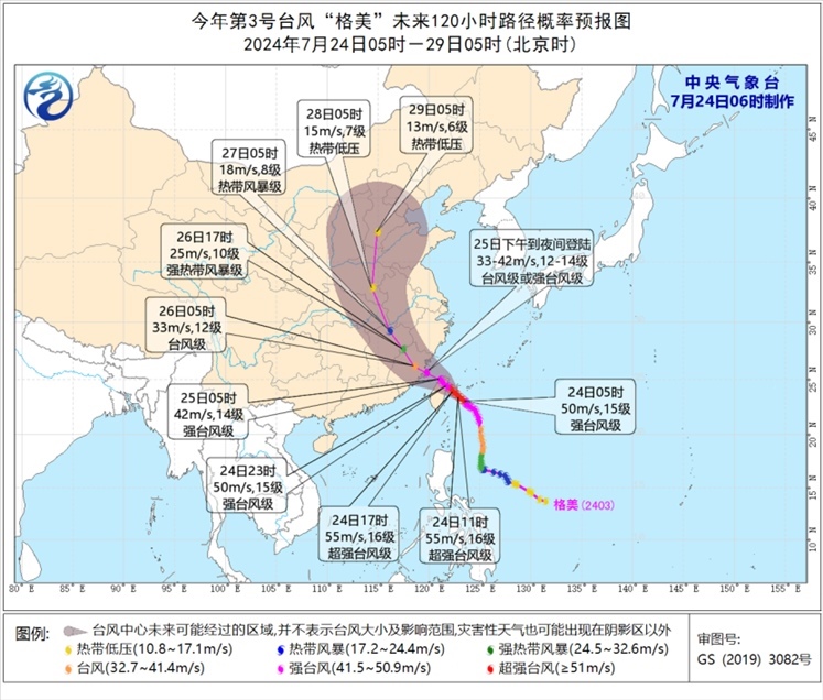 大風(fēng)預(yù)報(bào):7月24日08時(shí)至25日08時(shí),黃海西南部、東海大部及釣魚島附近海域、臺灣海峽、臺灣以東洋面、巴士海峽、南海大部、臺灣島沿海、浙江沿海、福建沿海、江蘇東南部沿海、上海沿海、長江口區(qū)、杭州灣將有7-9級大風(fēng),其中東海南部及釣魚島附近海域、臺灣以東洋面、臺灣島東部和北部沿海、福建中北部沿海的風(fēng)力有10-12級,“格美”中心經(jīng)過的附近海面或地區(qū)的風(fēng)力有13-16級,陣風(fēng)17級以上。