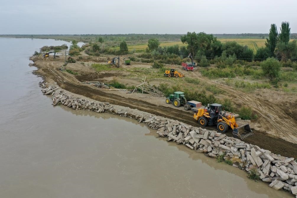 2024年8月3日,在新疆阿克蘇地區(qū)沙雅縣蓋孜庫木鄉(xiāng)吐央村,搶險人員駕駛大型機械進行堤壩加固(無人機照片)。新華社記者 丁磊 攝