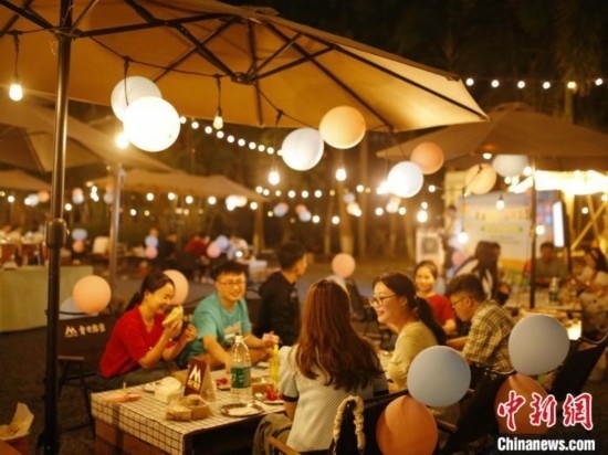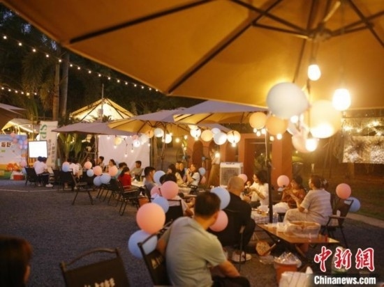 活動(dòng)現(xiàn)場(chǎng),搭建了露營(yíng)帳篷、休閑桌椅一字排開,布置了彩色氣球,提供甜品、水果、飲料等,燈光閃爍、晚風(fēng)習(xí)習(xí),氛圍甜蜜而浪漫。