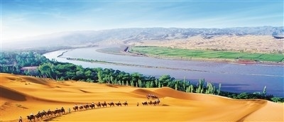 中衛(wèi)沙坡頭北接騰格里沙漠,南臨黃河,集大漠、黃河、高山、綠洲于一體,兼具西北的雄奇和江南的秀美。