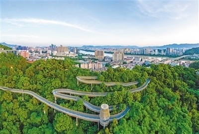 生態(tài)道福建福州市在建設(shè)“福道”時(shí),采取鋼結(jié)構(gòu)高架、鏤空橋面棧道、節(jié)點(diǎn)大跨度橋梁等創(chuàng)新設(shè)計(jì),最大限度保護(hù)森林原生態(tài)。林雙偉攝(人民視覺)