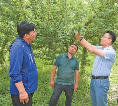 走進居民玉素普艾力·達吾提的果園,徐學彬正與果農(nóng)交流農(nóng)業(yè)知識:“今年人工授粉,掛果挺好,但還要把防蟲、疏果、施肥放在心上,這才能保證果實的品質(zhì)。”玉素普艾力·達吾提連連點頭,說:“你放心,我記著!”