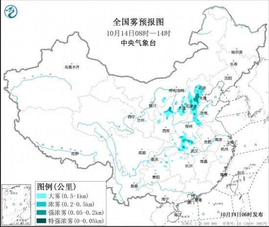 預(yù)計(jì),10月14日早晨至上午,河北中南部、北京、天津西部、山東西部、山西中東部、陜西北部、河南東北部和南部部分地區(qū)、湖北中部等地有大霧天氣,其中,河北中南部、北京西部、山西中部、陜西北部、湖北中部等地的部分地區(qū)有能見(jiàn)度低于500米的濃霧,局地有不足200米的強(qiáng)濃霧。中央氣象臺(tái)14日06時(shí)繼續(xù)發(fā)布大霧黃色預(yù)警。此外,14日,華北中南部、黃淮中西部、汾渭平原等地大氣擴(kuò)散條件較差,有輕至中度霾,其中,北京南部、河北西部沿山部分地區(qū)有重度霾。14日夜間起,受冷空氣影響,上述地區(qū)霧霾天氣自北向南逐漸減弱或消散。