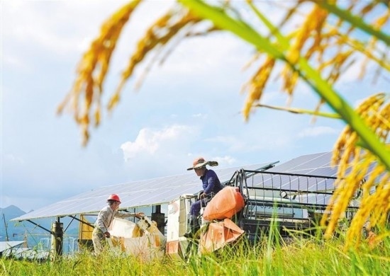10月10日,湖南省東安縣紫溪市鎮(zhèn)中心村,農(nóng)民在高標準農(nóng)田收獲晚稻。今年前三季度,全國夏糧早稻產(chǎn)量合計17795萬噸,比上年增加346萬噸,增長2.0%。蔡小平攝(中經(jīng)視覺)