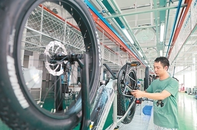 江西省九江經(jīng)濟(jì)技術(shù)開發(fā)區(qū)九江馳暢車業(yè)有限公司生產(chǎn)車間內(nèi),工人正在組裝銷往歐美市場(chǎng)的新能源助力自行車。魏東升攝(人民視覺)