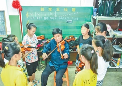 教學(xué)漸漸步入正軌后,張玉立還將支教的范圍擴(kuò)大到其他4個(gè)同樣偏僻的鄉(xiāng)鎮(zhèn)。山路崎嶇,往返山間,張玉立樂此不疲?!啊亚俾曀瓦M(jìn)大山’不僅能夠豐富孩子們的生活,還可以幫助他們走出大山?!睆堄窳⒄f,經(jīng)過一段時(shí)間的教學(xué)以后,自己開始有意識(shí)地挑選對小提琴有興趣、有天賦的孩子,成立小提琴班,利用課外時(shí)間進(jìn)行專門訓(xùn)練。