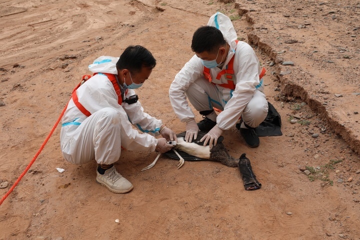 在甘肅張掖黑河濕地國家級(jí)自然保護(hù)區(qū),單國鋒(左)和同事為一只黑鸛戴上監(jiān)測(cè)設(shè)備(資料照片)。新華社發(fā)(甘肅張掖黑河濕地國家級(jí)自然保護(hù)區(qū)管理局供圖)