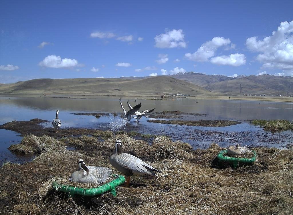 在甘肅尕海則岔國家級(jí)自然保護(hù)區(qū),棲息的斑頭雁通過人工鳥巢坐巢孵化后代(資料照片)。新華社發(fā)(甘肅尕海則岔國家級(jí)自然保護(hù)區(qū)管理局供圖)
